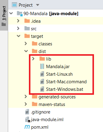 Stáhněte si spouštecí skripty pro koncového uživatele zde: Java-Training–Projects–Java-1–Lekce12-Skripty.zip. Rozbalte je do PROJEKT/src/dist. Mělo by to vypadat jako na obrázku: